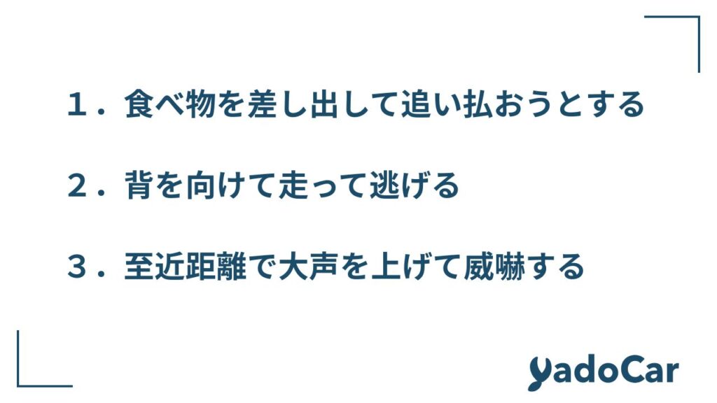 全部アウトだね。餌は定着の原因になるし、大声は逆に攻撃させる引き金になる。背を向けて走るのも論外。焦った動きが一番危ないから、状況別に「やらないこと」だけでも頭に入れておくと冷静に対処しやすいよ。
