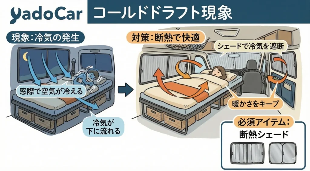 冬の車中泊において、車内の熱が最も逃げていく場所は「窓」です。住宅の壁には断熱材が入っていますが、車のガラスは薄く、外気の影響をダイレクトに受けてしまいます。ここで発生するのが「コールドドラフト」という現象です。これは、夜間の冷気で冷やされたガラス面に車内の空気が触れることで急激に温度が下がり、冷たく重くなった空気がまるで滝のように下へと流れ落ちてくる現象を指します。この冷気は寝ている人の顔や肩口を直撃し、車内全体の気温を一気に下げてしまいます。そのため、どれほど高価で-30℃対応の寝袋を用意したとしても、窓ガラスが剥き出しの状態であれば、次々と降り注ぐ冷気によって保温効果は相殺されてしまいます。まずは専用のシェードや銀マットで窓を隙間なく覆い、冷気の侵入ルートを断つことが防寒対策の最優先事項となります。