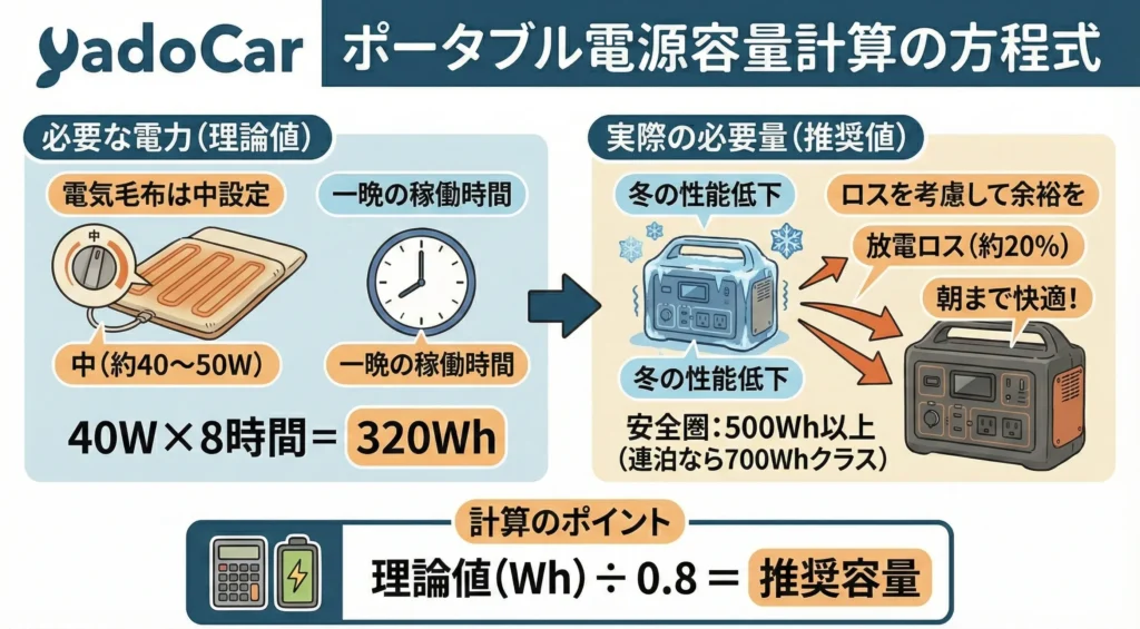 適当な容量だとその「絶対イヤな事態」になるわよ。冬はバッテリー性能も落ちるから、余裕を持った計算が必須。あと、毛布はただ掛けるだけじゃ電気の無駄遣いね。